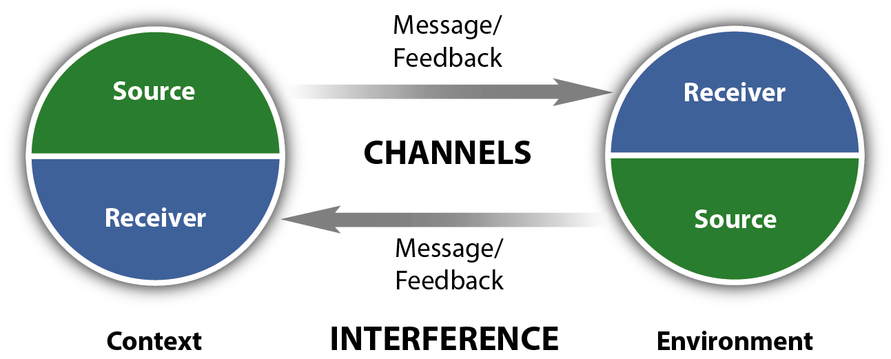 Rather than looking at the source sending a message and the receiver receiving it as two distinct acts, researchers often view communication as a transactionalModel of communication in which actions happen at the same time. process (Figure 1.1), with actions often happening at the same time. For example, the distinction between source and receiver is blurred in conversational turn taking, where both participants play both roles simultaneously.